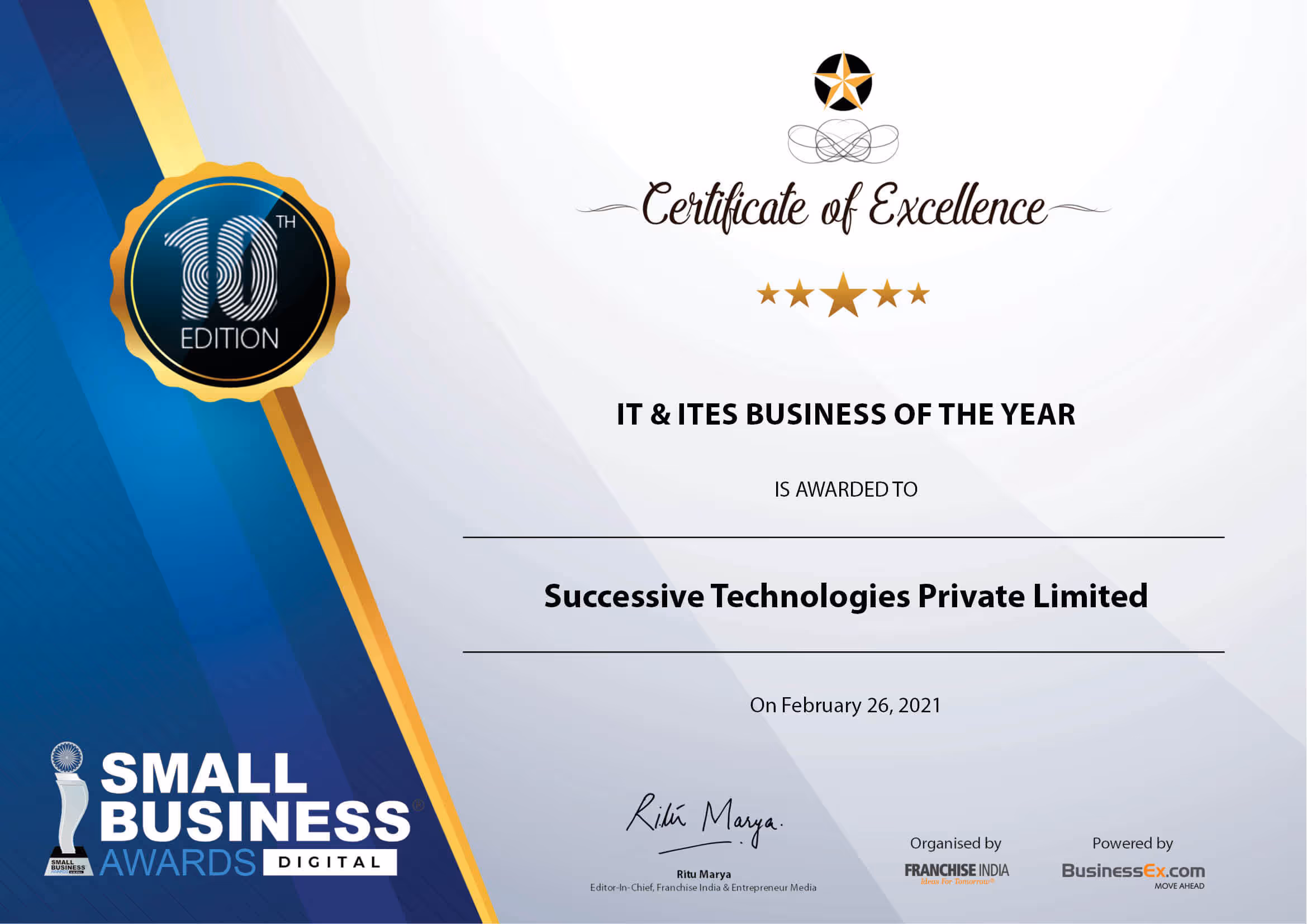 For the second time in a row, Successive Technologies got recognized at the Small Business Congress and Awards 2021 for the IT & ITeS Business of the year.