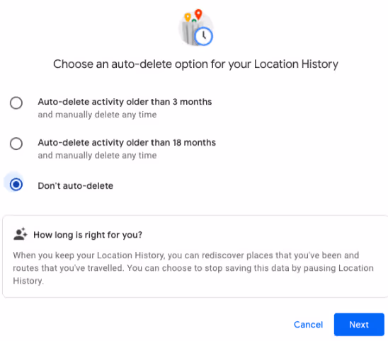 - Proceed to the auto-delete section under Web & App Activity, Location History, or YouTube History.