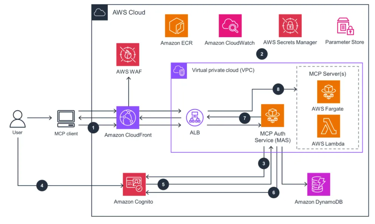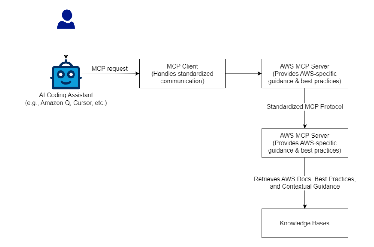 - AI Coding Assistant (e.g., Amazon Q, Cursor) forwards a request through MCP.